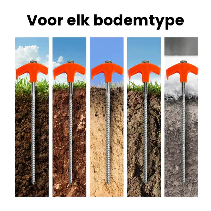 Deze tentstaken zijn geschikt voor allerlei ondergronden, van harde klei tot losse zandbodems. Hun unieke ontwerp zorgt ervoor dat ze diep in de grond kunnen worden geschroefd, waardoor ze veel beter bestand zijn tegen wind en andere krachten in vergelijking met traditionele tentstaken.